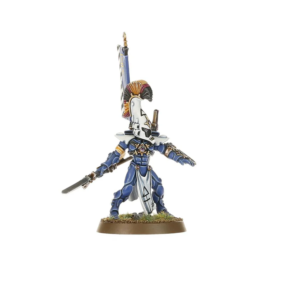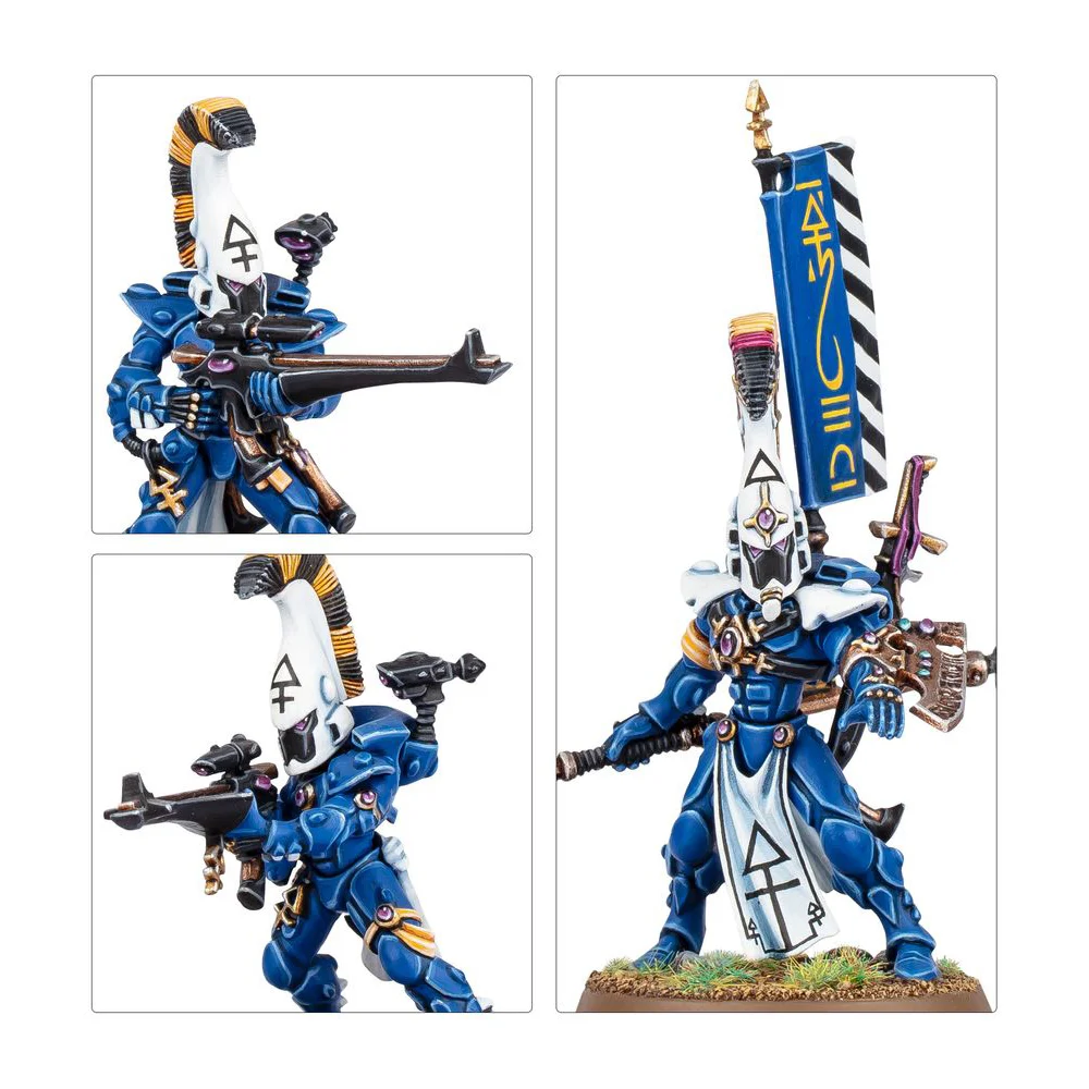Two of the Dire Avengers can be assembled as an optional Exarch who can be armed with a shuriken catapult, two shuriken catapults, a diresword and a shuriken pistol, or a power weapon and shimmershield. Each Exarch also has an optional back banner, and a choice of two heads – one helmeted and one bare, making it easy to personalise your squad leaders.