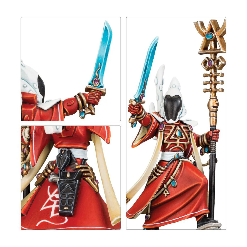 Spiritseer Kygharil guides their small band of determined Aeldari through the Webway to defend their craftworld’s hidden gateways and ancient, precious ruins. Lightning-fast Dire Avengers make up the bulk of this swift and deadly Combat Patrol. Joining them are a squad of elite Wraithblades armed with deadly ghostaxes, and a unit of Warp Spiders who attack by making short but dangerous leaps through the Immaterium before firing clouds of razor-sharp monofilament wire at the foe.