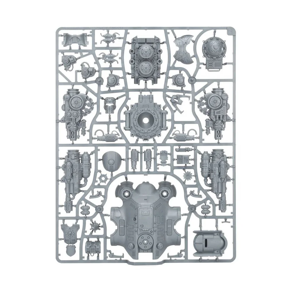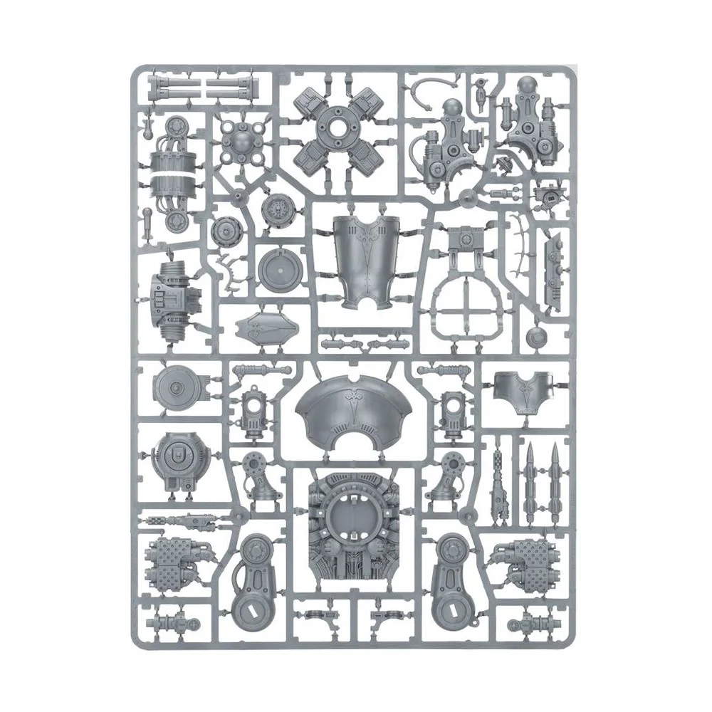 This multipart plastic kit builds one mighty Knight Questoris, a towering war machine armed with colossal weapons designed to lay waste to infantry, vehicles, and opposing Knights. The kit can be built with a huge variety of weapon combinations – it includes an arm-mounted reaper chainsword, thunderstrike gauntlet, rapid-fire battle cannon, avenger gatling cannon, thermal cannon, and las-impulsor. The hull features your choice of a heavy stubber, multi-laser, or meltagun, and its carapace can be mounted with an optional twin-linked icarus autocannon, ironstorm missile pod, or stormspear rocket pod. There are also a wealth of cosmetic options for personalising this engine of war, including tilting plates, carapace icons, banners, and faceplates. This kit also builds one Household Scion on foot, and the Knight itself can be built with an open carapace showing the Scion piloting his mechanical steed.
