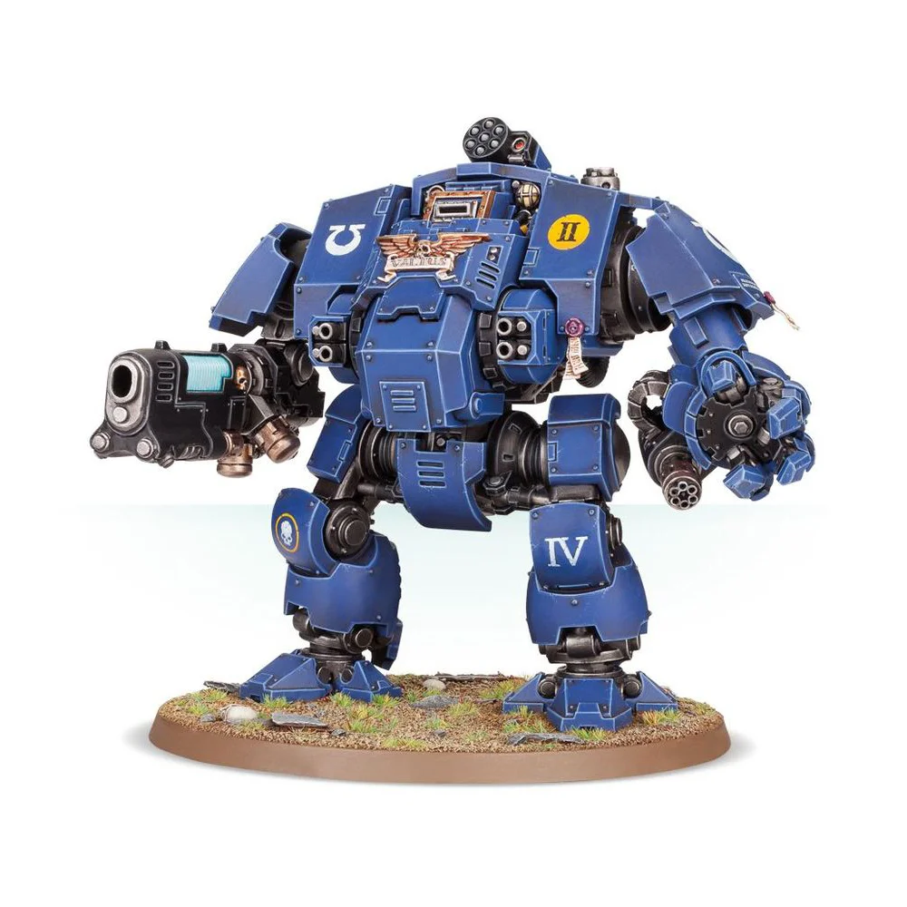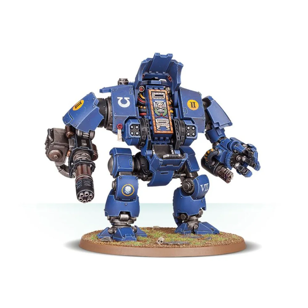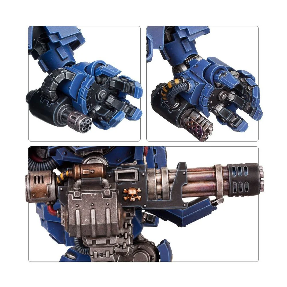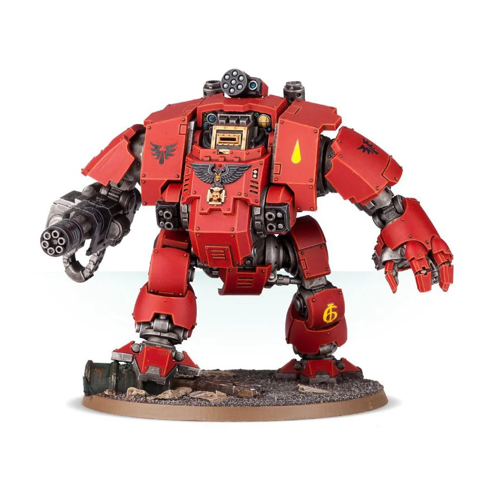 Redemptor Dreadnoughts are giant war machines that crush bone and splinter skulls as they bludgeon through enemy ranks. Taller, broader and more cunningly wrought than the Dreadnoughts of traditional design, these goliaths of battle are powered by hyper-dense reactors and sophisticated fibre bundles. They can accelerate from a thudding stomp to a loping, thunderous gait that shakes the ground, barrelling through hails of fire in glorious defiance. Such is the miraculous design of the Redemptor’s neural links that its inhabitant, despite being entombed in the sarcophagus within the Dreadnought’s chest, can exercise control with surprising dexterity and speed.