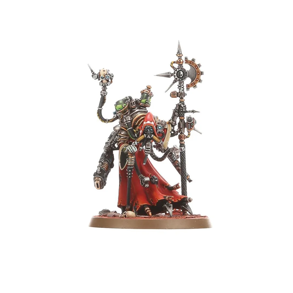 This miniature cuts an imposing figure, augmented to the point of being almost entirely cybernetic. His insectile metal legs and various extra arms lend him an air of alienation, and his two interchangeable heads mean he can be customised to fit both Cult Mechanicus and Skitarii images. He features an impressive array of weapons; included is a volkite blaster, a macrostubber, an eradication ray, a phosphor serpenta and a power axe – this is his badge of office, and is detailed with a microphone and loudspeaker.