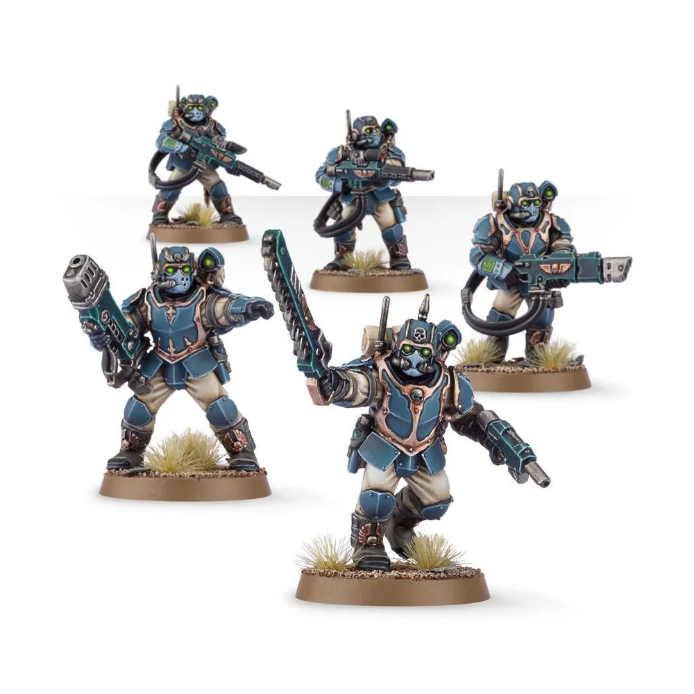 This multipart plastic kit builds five Tempestus Scions – the soldiers of the feared Militarum Tempestus. Each model can be armed with a hot-shot lasgun, and the kit includes an optional vox-caster as well as an arsenal of additional weapons to equip specialist gunners – a plasma gun, meltagun, grenade launcher, flamer, or hot-shot volley gun. You’ll also find parts to build one model as a Tempestor squad leader with a variety of alternative weapons – a chainsword, power fist, or power sword for melee combat, and a hot-shot laspistol, bolt pistol, or plasma pistol for ranged fire.