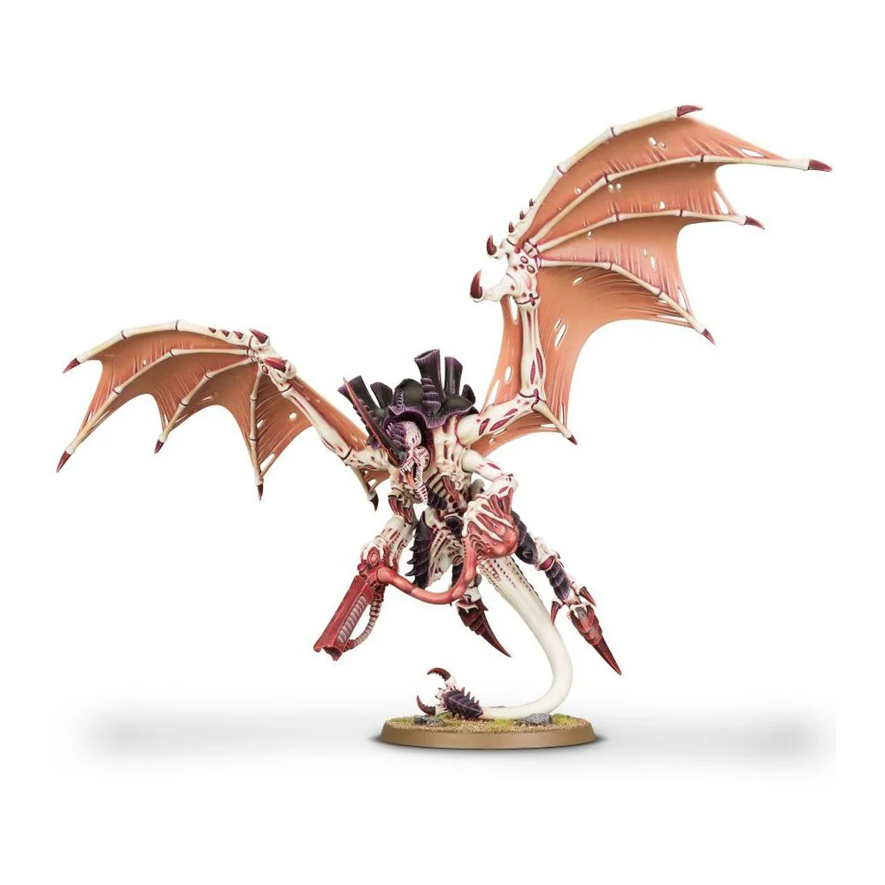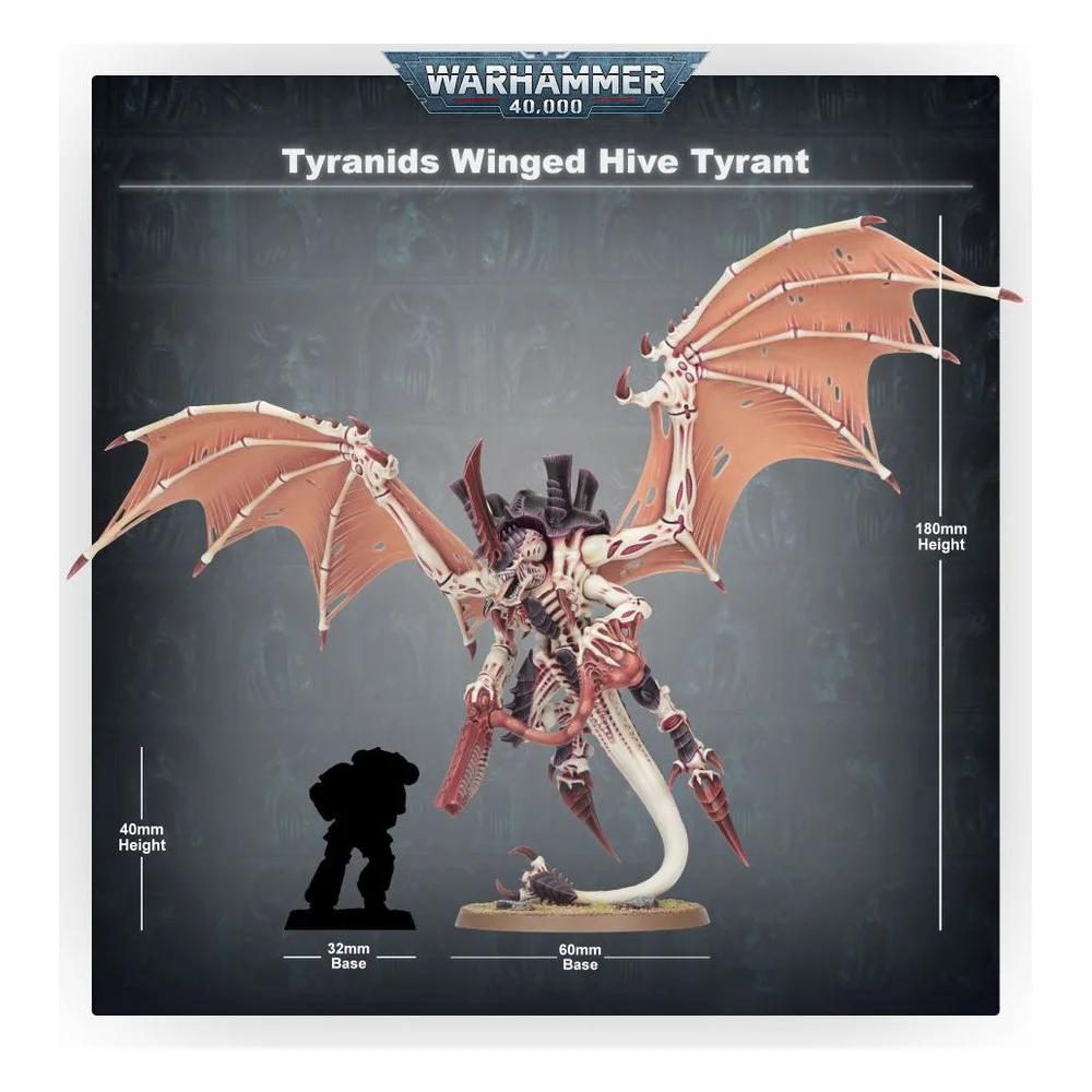 Hive Tyrants enact the Hive Mind’s will on the battlefield, as the massive commanders of the Tyranid swarm. Winged Hive Tyrants are spawned to control airborne swarms and provide a mobile synaptic nexus. Wielding an array of nightmarish organic weapons, their monstrous forms singing with the synaptic might of the Hive Mind, these dread swarmleaders spread terror and death wherever the dark shadow of their wings falls.